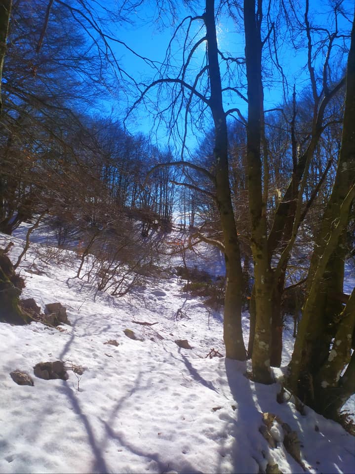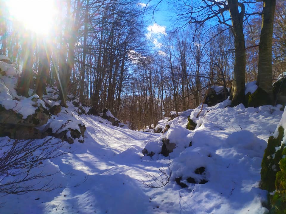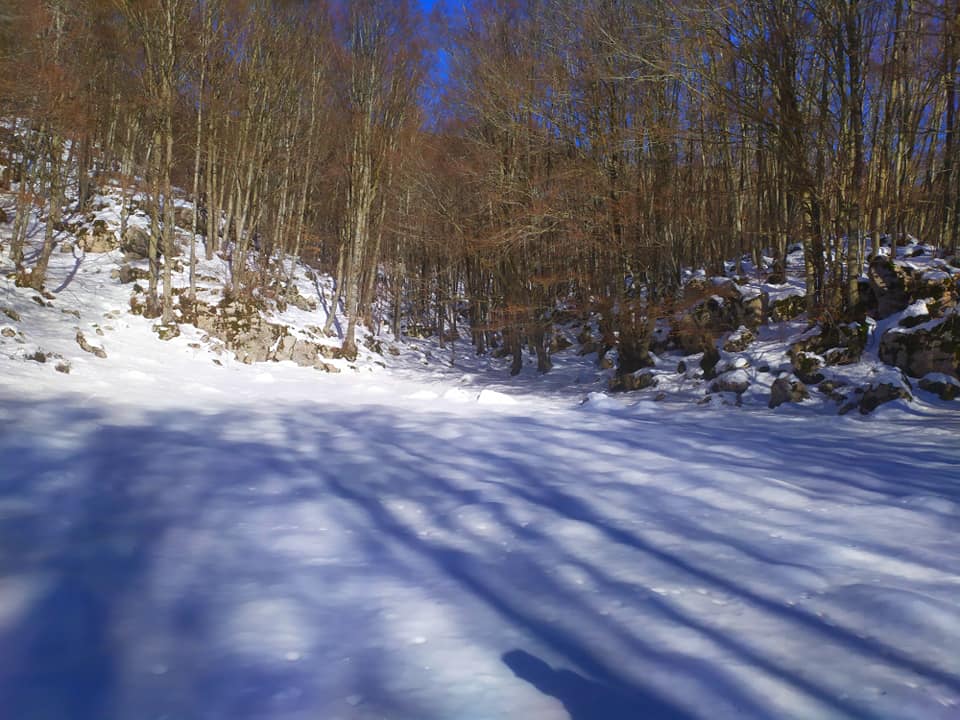 Raggiungiamo Rifugio Faito muovendoci in un bosco dagli alberi immensi, spogli di foglie, e i cui busti si ergono, nudi e sottili, verso il cielo.