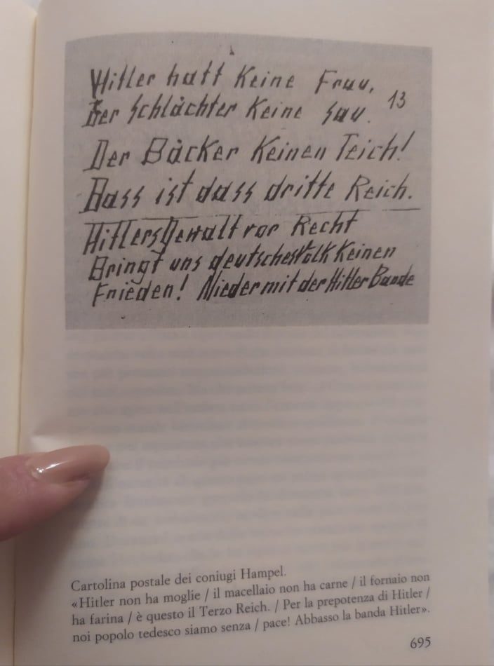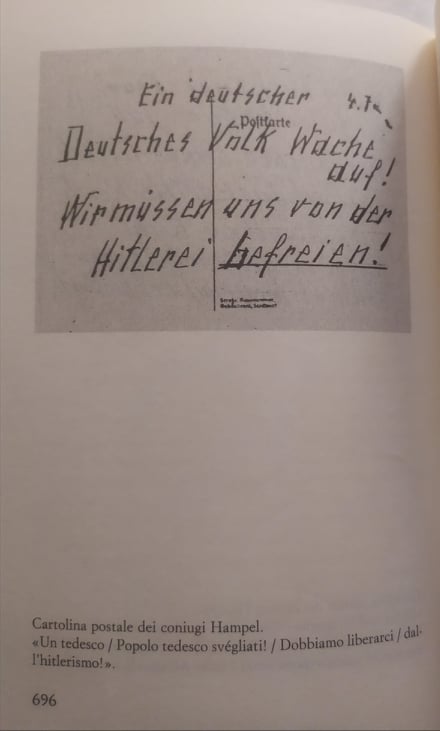Questo libro mi sembra un vero e proprio tentativo di dare voce a quelle emozioni così forti che hanno permesso alla vicenda di accadere, ma che sono state completamente annullate dalla Gestapo. Il tentativo di Fallada è, sì, far conoscere la storia, ma anche umanizzarla, conferire sentimenti a quegli incartamenti sterili e vuoti dai quali non emergono la tenacia e la forte resistenza opposta da queste persone al regime nazista.