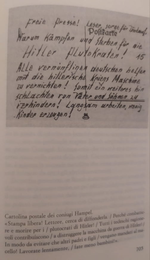 Cartoline rivelatrici di una verità così semplice eppure così complessa e temibile, sia per i cittadini sia per il nazismo stesso: se circolassero come i Quangel sperano, ci sarebbe una sommossa da parte del popolo, e il tappeto di omertà, di vigliaccheria e ottundimento che permea Berlino verrebbe sostituito da una tensione alla libertà e alla riconquista del proprio pensiero.