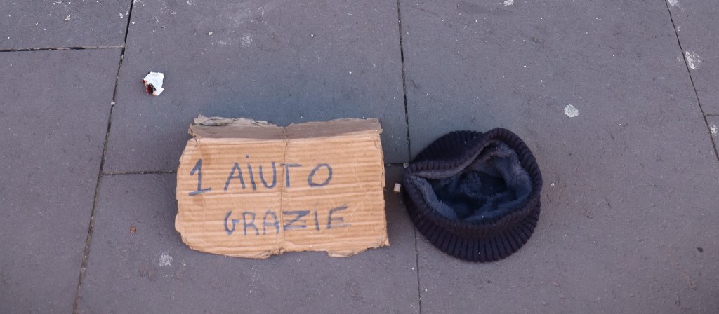 Oggi mi hanno colpito un cartello e un sorriso. Camminavo lungo via Cola di Rienzo, che era lunghissima e non ne vedevo mai la fine, quando guardo a terra e vedo un cartone marrone chiaro con una scritta blu “1 aiuto grazie”. Un ragazzo seduto e uno affianco a lui, in piedi. Si sorridono e io non posso fare altro che avvicinarmi, voglio partecipare anche io a quella scena, avere il permesso di entrarci in punta di piedi per capirne di più.