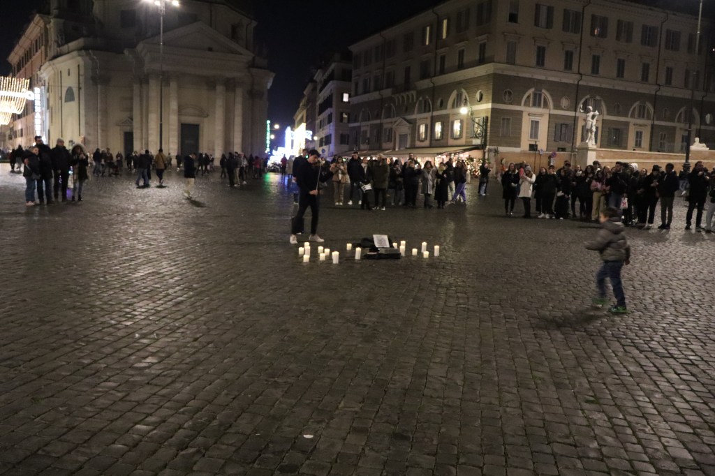 In serata mi trovo a piazza del Popolo dove mi imbatto in un ragazzo di cui non ricordo il nome, che suona il violino circondato di candele. Tutti lo ascoltano rapiti, e la sua musica è prorompente ma con toni soavi. Gli vado a parlare e scopro che è brasiliano, frequenta il conservatorio di Santa Cecilia e suona per il pubblico della strada da quattro anni. Lo preferisce ai palchi. Mentre parliamo sta rimettendo in ordine il suo bel violino di legno e le candele.